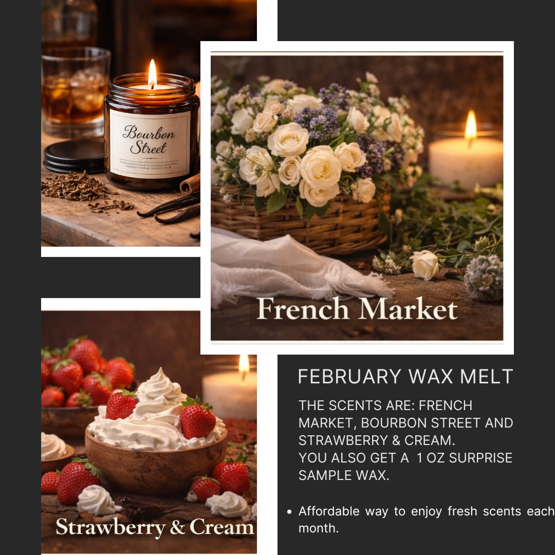 Enjoy a little happy mail each month with three handcrafted 100% soy wax melts for just $15. Every scent is a surprise—thoughtfully curated and delivered to you on or before the 15th of each month.